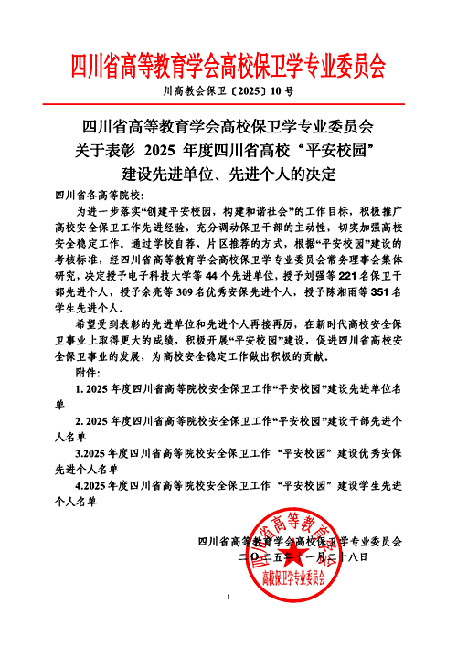 11月28日,四川省高等教育学会高校保卫学专业委员会发布《关于表彰2025年度四川省高校“平安校园”建设先进单位、先进个人的决定》,伟德官网榜上有名,荣获集体与个人荣誉,实现“平安校园”建设领域的重要突破。学院被授予“2025年度四川省高等院校安全保卫工作‘平安校园’建设先进单位”,学院后勤保卫处处长何胜荣荣获“保卫干部先进个人”,后勤保卫处安保人员胡建勇、李玉梅荣获“优秀安保先进个人”,学生付琼祯荣获“学生先进个人”...
