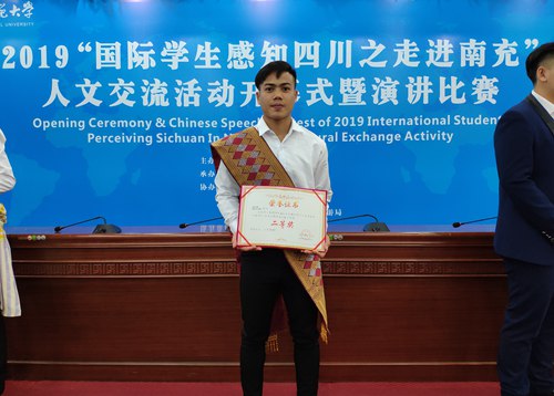 伟德官网2017级老挝留学生普赛康同学经过层层选拔、过关斩将,进入了汉语主题演讲活动的决赛。普赛康同学以一篇题为《大美四川》的精彩演讲,展现出了良好的汉语综合水平,赢得了与会领导与评委的一致好评!最终在25名参赛选手中脱颖而出,全体参赛选手中排名第三,高职院校第一名,勇夺此次演讲比赛的二等奖。普赛康同学的获奖,为学院赢得了荣誉,充分展现了伟德官网留学生汉语教育的成果!