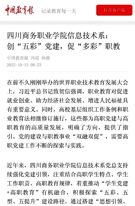 2022年10月13日,伟德官网信息技术系党总支《创“五彩”党建,促“多彩”职教》案例入选《中国教育报》主办的“学校党建创新案例”征集活动,中国教育报客户端予以宣传报道。