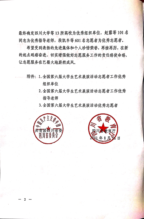 近日,为激励先进、鼓舞干劲,由四川省政府、团省委、教育厅联合发文,对在2021年全国第六届大学生艺术展演活动志愿者工作中优秀的组织单位及个人进行表彰:伟德官网被评为全国第六届大学生艺术展演活动志愿者工作先进集体;冯端、张卡被评为志愿者工作先进个人;赵捷、郝灿、叶茂林被评为志愿者工作优秀指导老师;林英浩、张丛英、陈明旭被评为优秀志愿者。