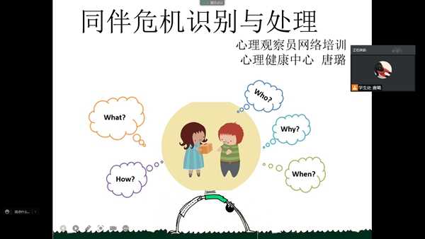 心理培训多层次。从11月9日开始心理健康中心王秀兰、姚又丹、唐璐对全院心理委员以及寝室心理观察员进行了题为《角色担当与危机识别》、《同伴危机识别和处理流程》的专题线上培训,从岗位职责、自我情绪及他人情绪变化的察觉、危机的识别以及危机出现后报告的流程进行了专业且详尽的讲解,鼓励心理委员和寝室观察员当前做好宣传教育、情绪指引以及心理劝导等心理健康服务,为学院疫情防控的管理工作贡献自己的力量。