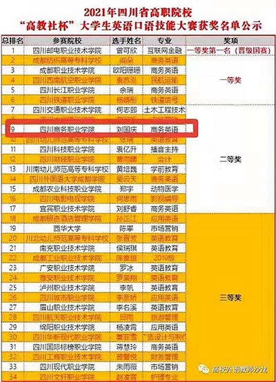 4月29日,2021四川省高职院校“高教社杯”大学生英语口语技能大赛在成都纺织高等专科学校举行,伟德官网经济贸易系商务英语专业学子刘国庆代表伟德官网参赛,最终获得四川省省级二等奖。