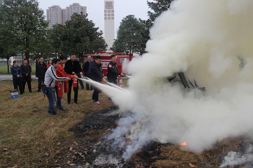 随后由消防队相关人员讲解灭火器的原理、基本操作方法、注意事项及高压水枪的使用方法。在认真观看消防官兵示范后,参加此次演练的院领导及同学们亲自体验了现场灭火的过程,面对熊熊燃烧的火堆,表现得积极勇敢,按照使用灭火器的方法和步骤,将大火迅速扑灭,做到了冷静处理,得到了消防人员的认可。