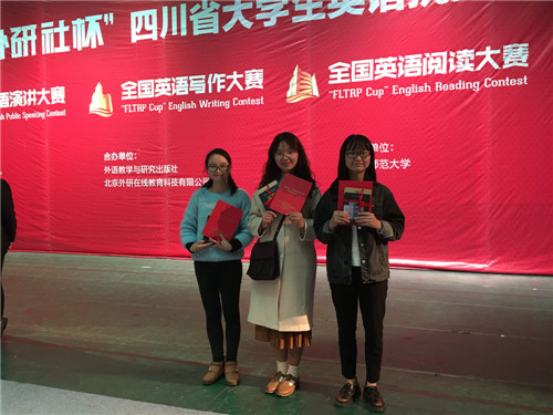 10月28至29日,伟德官网经济贸易系15级商务英语专业学生熊珍珍、王艳萍、16级商务英语专业学生胡诗瑶在三位指导教师周倩倩、张蕾、童玲老师的带领下,赴四川师范大学参加由四川省教育厅主办、四川师范大学及外语教学与研究出版社承办的2017“外研社杯”全国大学生英语挑战赛四川赛区竞赛,分别斩获大学生英语演讲大赛一等奖,英语阅读大赛一等奖,英语写作大赛二等奖。