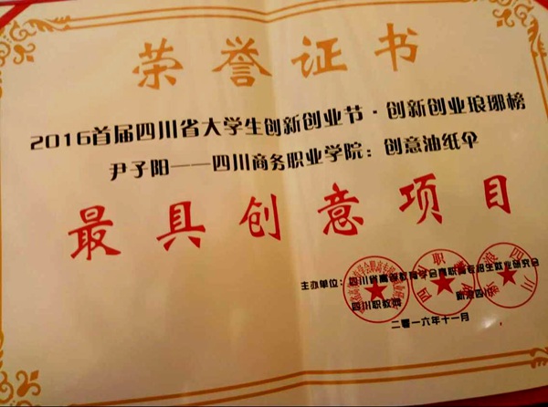 11月4日,伟德官网2014级环境艺术三班尹子阳的创意油纸伞项目在2016四川省大学生创新创业节创新创业琅琊榜上获得最具创意项目奖。