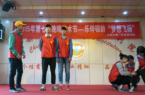 10月23日下午,屋外蒙蒙细雨,室内暖意洋洋。志愿者们怀着诚挚之心,来到了洋溢着温馨气息的成都市第一福利院。福利院院长热情的接待了大家。志愿者与老人们一起观看并参与第七届晚晴艺术节——“乐伴银龄、飞扬梦想”。活动结束后,同学们有的打扫现场,有的细心护送老人们返回寝室,有的陪老人聊天、义务劳动……大家用多种方式与老人交流,时间在欢声笑语中飞逝。活动最后,一张笑容灿烂的合影和一颗颗满怀感恩的心,是留给同学们最好的礼物。