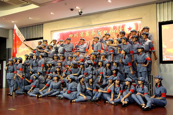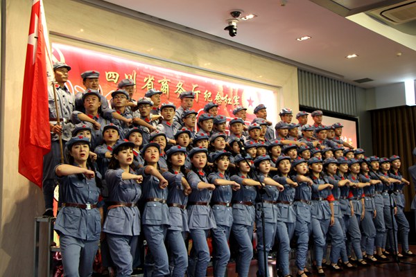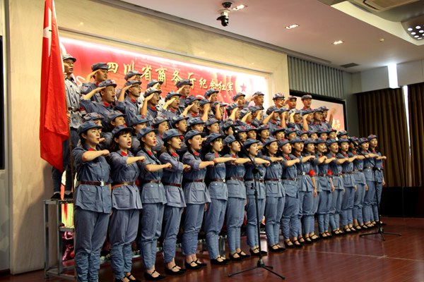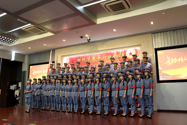 9月29日下午2:00,四川省商务厅纪念红军长征胜利80周年红歌会在厅机关隆重举行,伟德官网全体院级领导及部分师生代表近80人参加了本次红歌会。历时一个多月的精心编排和悉心准备,伟德官网党委宣传部、工会负责组织并选送的大合唱《突破封锁线》排在第九个节目出场,师生们以深情的朗诵、优美的歌声、甜美的笑容、和谐的动作、唯美的画面赢得了全场观众雷鸣般的掌声,给大家留下了深刻的印象,最终取得一等奖的优异成绩。