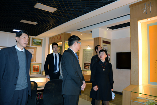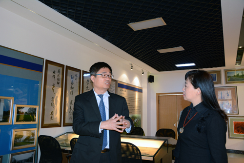 在授牌仪式开始前,由经管系领导陪同朱承鸿本部长一行,参观了学院校史馆。接着,双方领导来到会议室,就校企合作人才培养体系面对面进行了深入交谈。