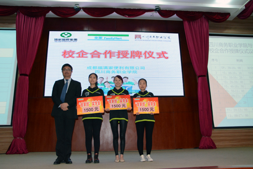 授牌活动正式开始。顶新国际集团便利事业群西南区域公司总监李健鹏手持“校企合作基地”牌子、学院副院长向宏志手持“教学实训与实习基地”牌子,在主持人的宣布下郑重交换,完成了这项严肃而又重大的授牌仪式。全家班三名学生分别获得一等学期奖学金1500元;十三名学生分别获得二等学期奖学金800元。至此,此次严肃而又隆重的授牌仪式,在主持人的总结中、全场热烈的掌声中圆满落下帷幕。