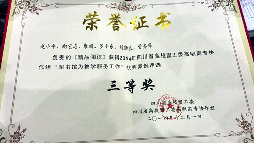 12月4日,四川省高校图工委高职高专协作组召开2014年年会暨“图书馆服务教学”研讨会。伟德官网 “图情信息——精品推送”工作获得了 “图书馆为教学服务工作”优秀案例评选三等奖。