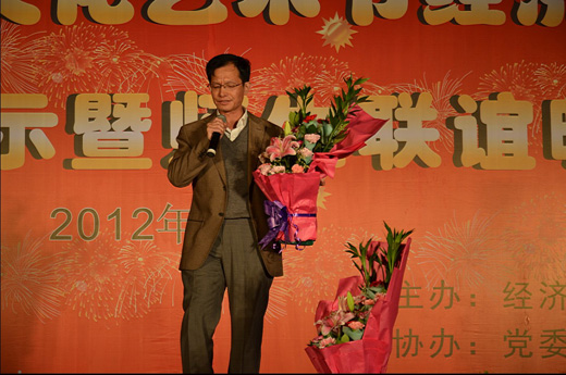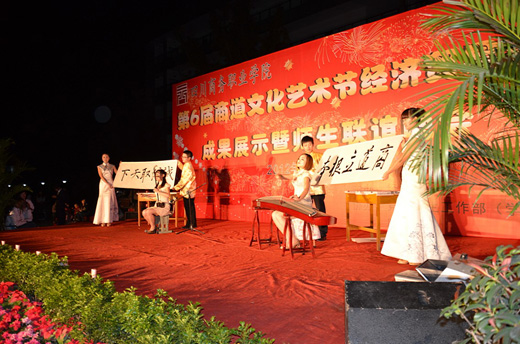 晚19时整,晚会正式开始。本次晚会分为成果汇报部分和文艺演出部分。本次晚会成果汇报部分由经济贸易系副主任曾理主持。首先,经济贸易系党总支副书记周发强对经济贸易系在第6届商道文化艺术节期间的活动成果进行了汇报演讲。其后,学院副院长郎院长作重要讲话,郎院长对经济贸易系的各项工作进行了肯定和表扬,也对经济贸易系全体师生提出了希望和要求,鼓励经济贸易系全体师生再接再厉,在学院的领导下共建和谐校园、商道文化。