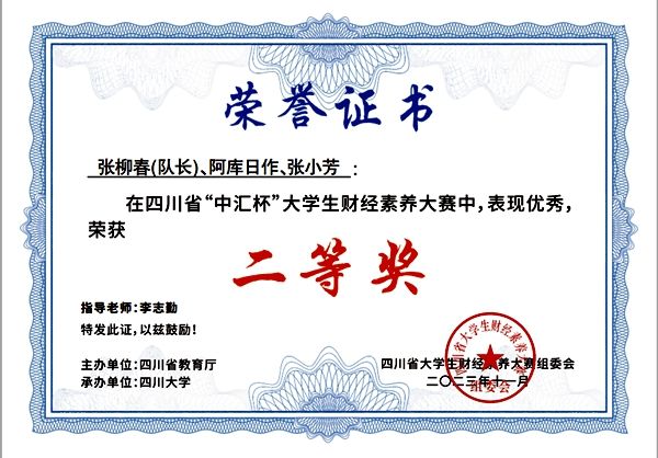 近日,由四川省教育厅主办、四川大学承办的2023年“中汇杯”四川省大学生财经素养大赛决赛落下帷幕,经过激烈的角逐,伟德官网李志勤、雷殷睿指导的学生团队获得省赛团体二等奖的好成绩。