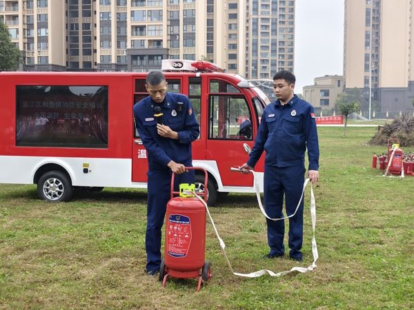 学院党委副书记张军强调了校园消防安全的重要性和开展消防演练的必要性。和盛消防站副站长、黄田坝消防中队副中队长为参演师生详细讲解了消防安全知识和灭火器的正确使用方法,并现场示范了如何正确使用灭火器。在消防员的指导下,参演师生、食堂工作人员纷纷上场进行“灭火”实战。
