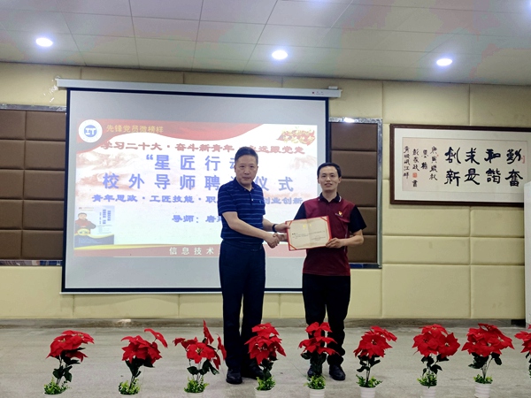4月19日,信息技术系“星匠行动”校外导师聘请仪式暨“商道匠心——劳模工匠精神进校园”主题讲座在文家校区学术报告厅顺利举行。参加本次活动的有学院党委委员、副院长官培生,校外导师唐建,系部负责人和教师代表,信息技术系各班学生代表、文家校区各系学生代表参会。