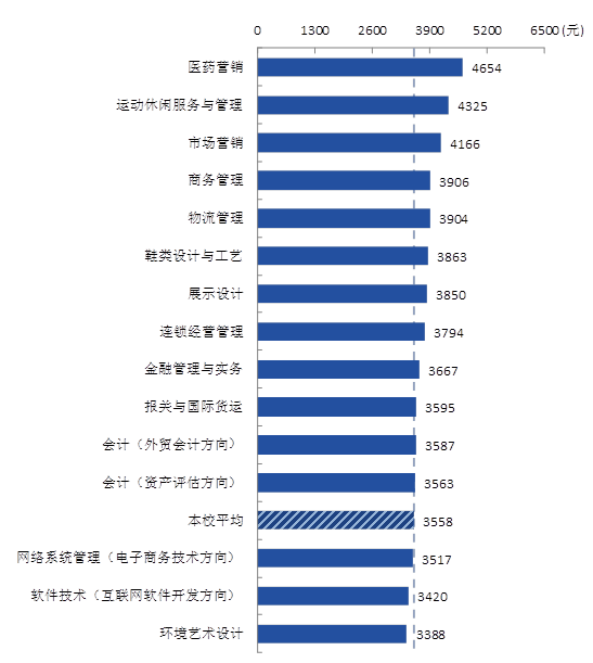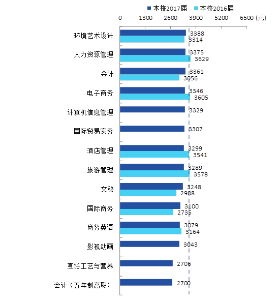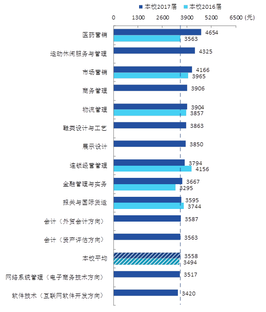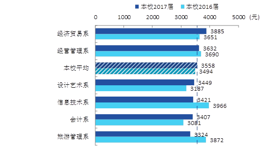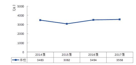 本校2017届毕业生的月收入为3558元,与本校2016届(3494元)基本持平,本校毕业生的月收入水平呈上升趋势。