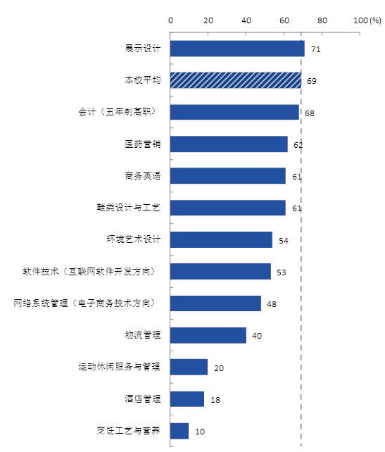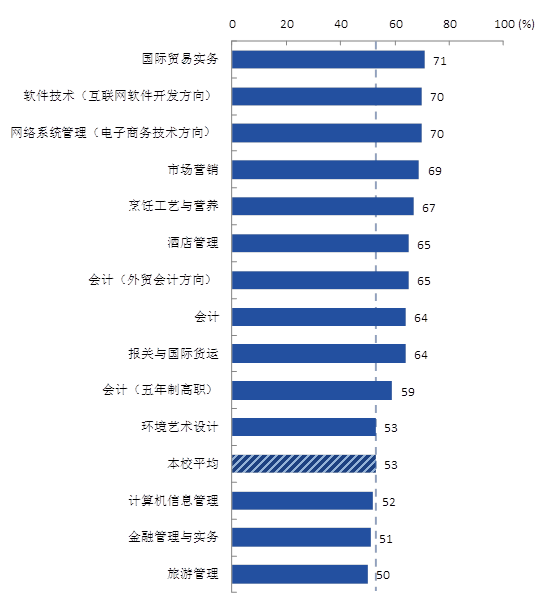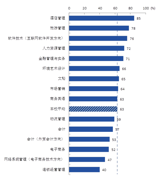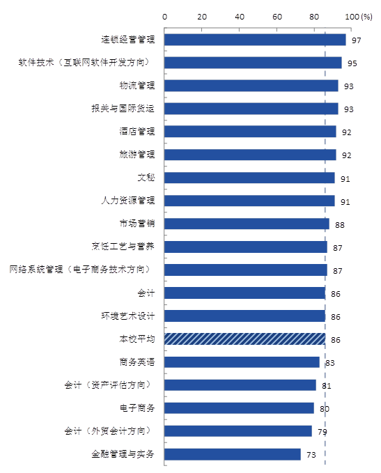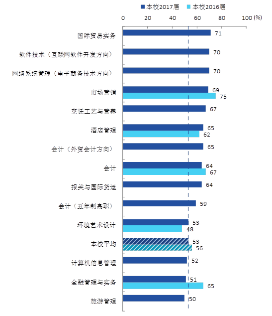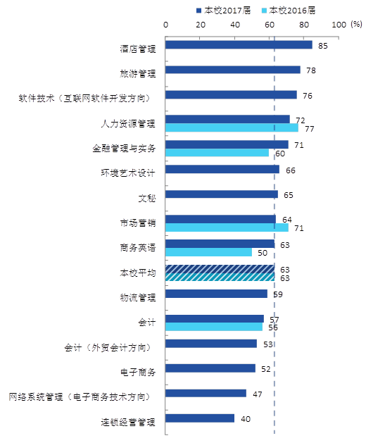 本校2017届就业现状满意度较高的专业是酒店管理(85%)、旅游管理(78%)、软件技术(互联网软件开发方向)(76%),就业现状满意度较低的专业是连锁经营管理(40%)、网络系统管理(电子商务技术方向)(47%)、电子商务(52%)。