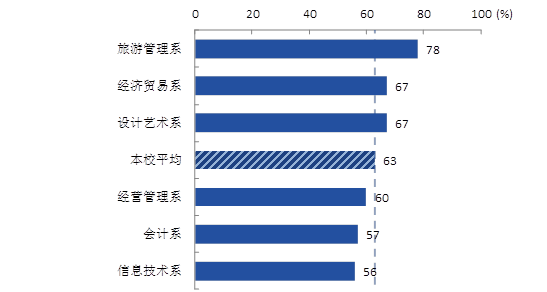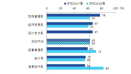 本校2017届就业现状满意度较高的院系是旅游管理系(78%),就业现状满意度较低的院系是信息技术系(56%)、会计系(57%)。
