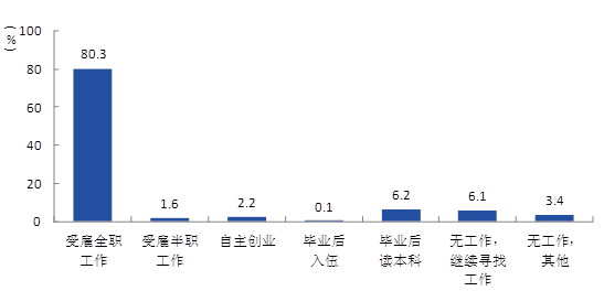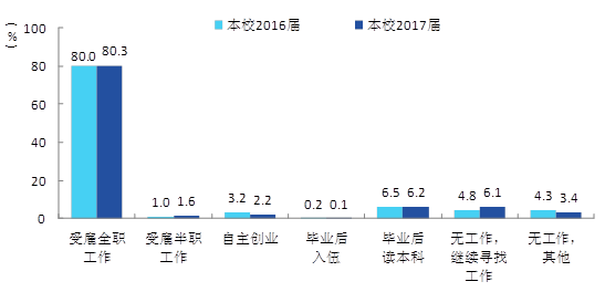 本校2017届“受雇全职工作”的比例为80.3%,与本校2016届(80.0%)基本持平。