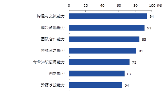 本校2017届毕业生认为工作中最重要的通用能力是“沟通与交流能力”(94%),其后依次是“解决问题能力”(91%)、“团队合作能力”(85%)等。
