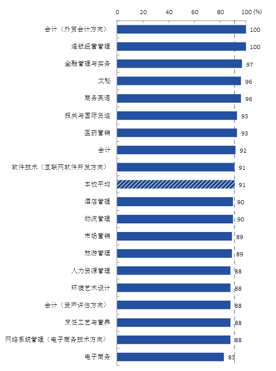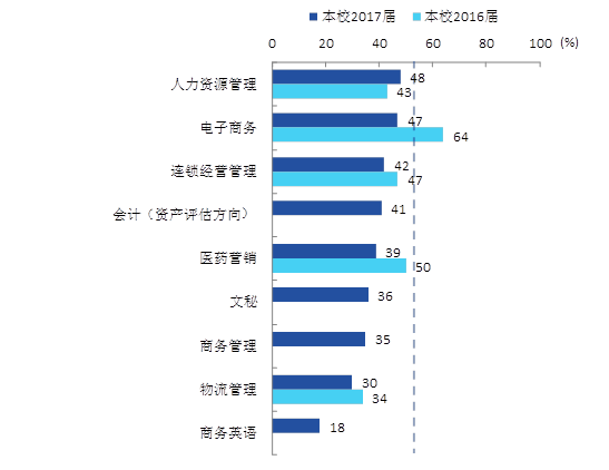 本校2017届教学满意度较高的专业是会计(外贸会计方向)、连锁经营管理(均为100%),教学满意度较低的专业是电子商务(83%)。