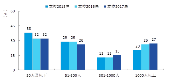 本校2017届毕业生主要就业的用人单位类型是民营企业/个体(78%),与本校2016届(77%)基本持平;本校2017届毕业生主要就业于300人及以下规模的中小型用人单位(58%),比本校2016届(61%)低3个百分点。