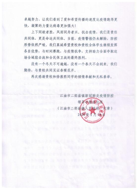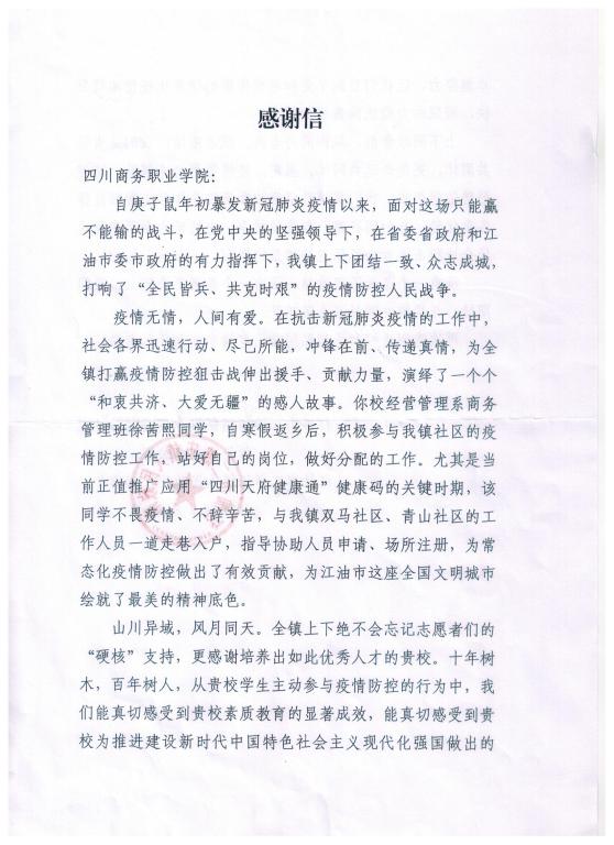 经营管理系20级商务管理班徐茜熙同学在去年新冠肺炎爆发期间,积极参加到江油市二郎庙镇社区的疫情防控工作中,不辞辛苦,为当地常态化疫情防疫工作作出了贡献。江油市二郎庙镇防疫办为表达感谢之情,特向伟德官网发来感谢信,充分肯定了徐茜熙同学的担当与奉献。
