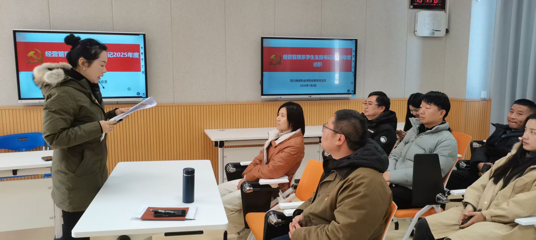 会议最后,教师支部书记程钰与学生支部书记何俊烨分别作 2025 年度述职报告,全面总结过去一年支部党建工作成效、存在问题及下一步工作计划,为后续党建工作提质增效明确方向。此次大会的召开,进一步统一了思想、凝聚了合力,为经营管理系高质量发展注入新的动力。