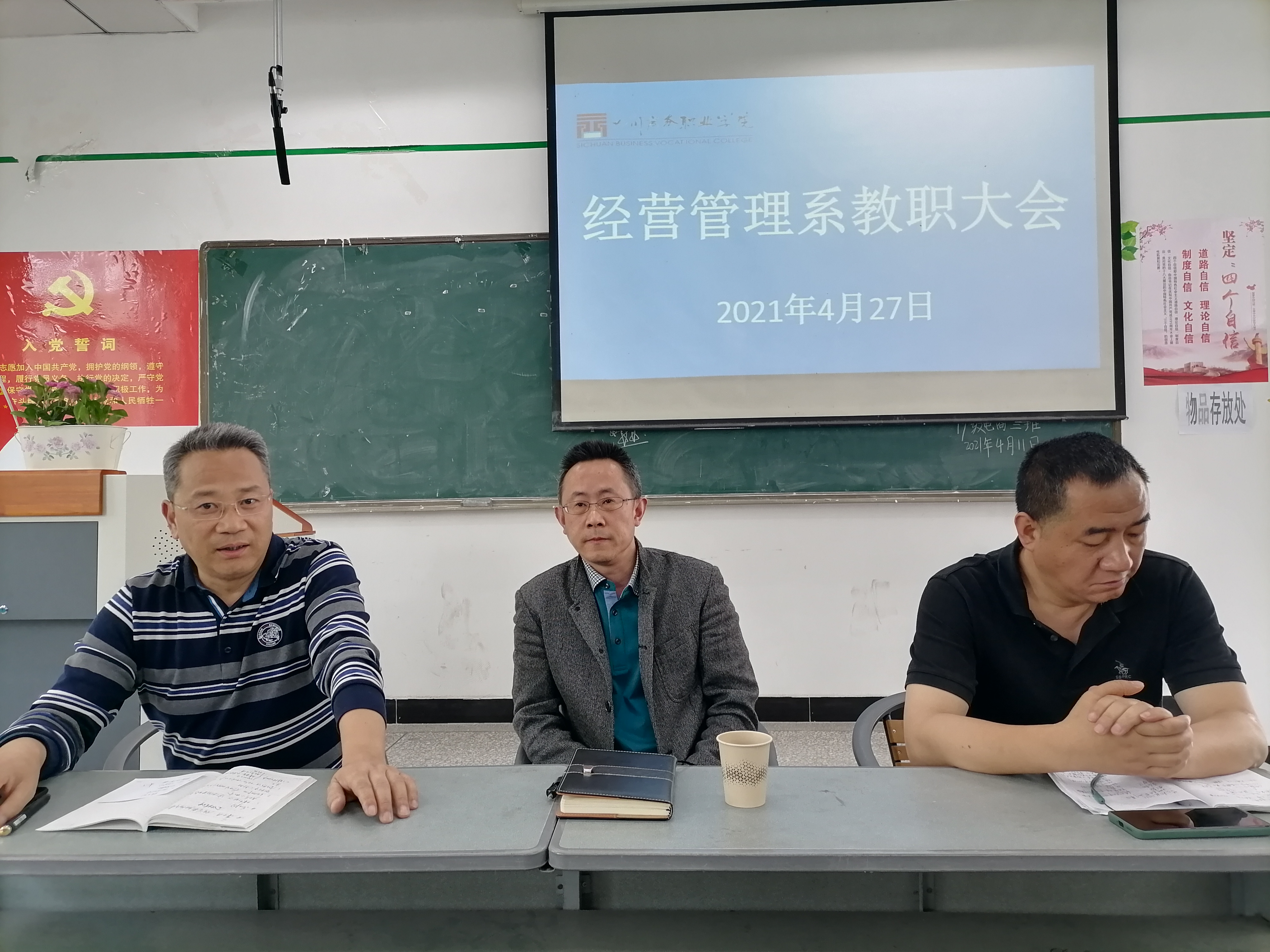 2021年4月27日下午2时,经营管理系于第一教学楼202室召开全系教职工会议。出席本次会议的有学院党委委员、纪委书记李文川,经管系主任梁栋,系党总支书记郑海波,系副主任王琦,全系教师,会议由系主任梁栋主持。