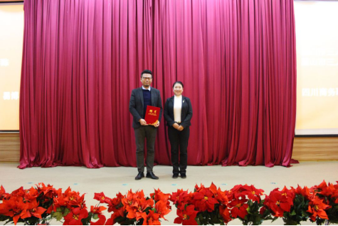 眉山市三人行创业服务有限公司总经理助理、眉山三人行创业孵化园副主任、党支部副书记李陈向伟德源自英国始于1946电子商务专业教师易博颁发兼职聘书。