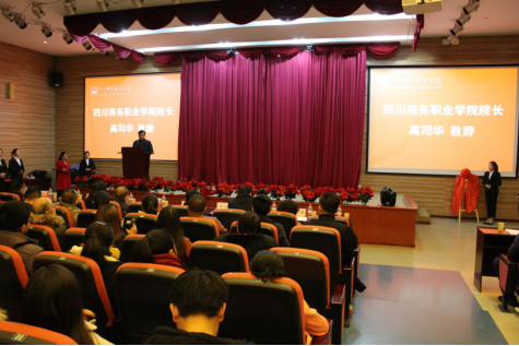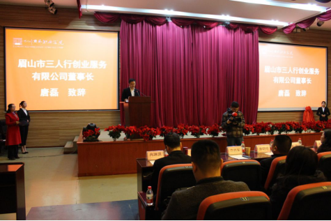 眉山市三人行创业服务有限公司董事长唐磊致辞,向各位领导、嘉宾介绍公司及校企合作有关情况。