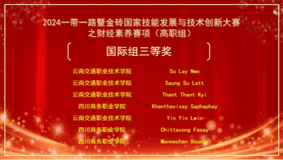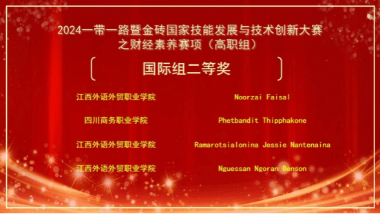 11月23日,“2024一带一路暨金砖国家技能发展与技术创新大赛第二届财经素养赛项”在云南财经职业学院盛大开幕。伟德官网2022级留学生堤安美、温欣、芙蓉、李博四位同学在经营管理系、国合中心、实践教学中心的精心筹备与悉心指导下,经过激烈而精彩的比拼,最终荣获一个二等奖和三个三等奖的优异成绩,为学院赢得了国际组优秀组织奖的殊荣。这是伟德官网自开展留学生教育以来,取得的迄今为止留学生技能大赛的最高荣誉。