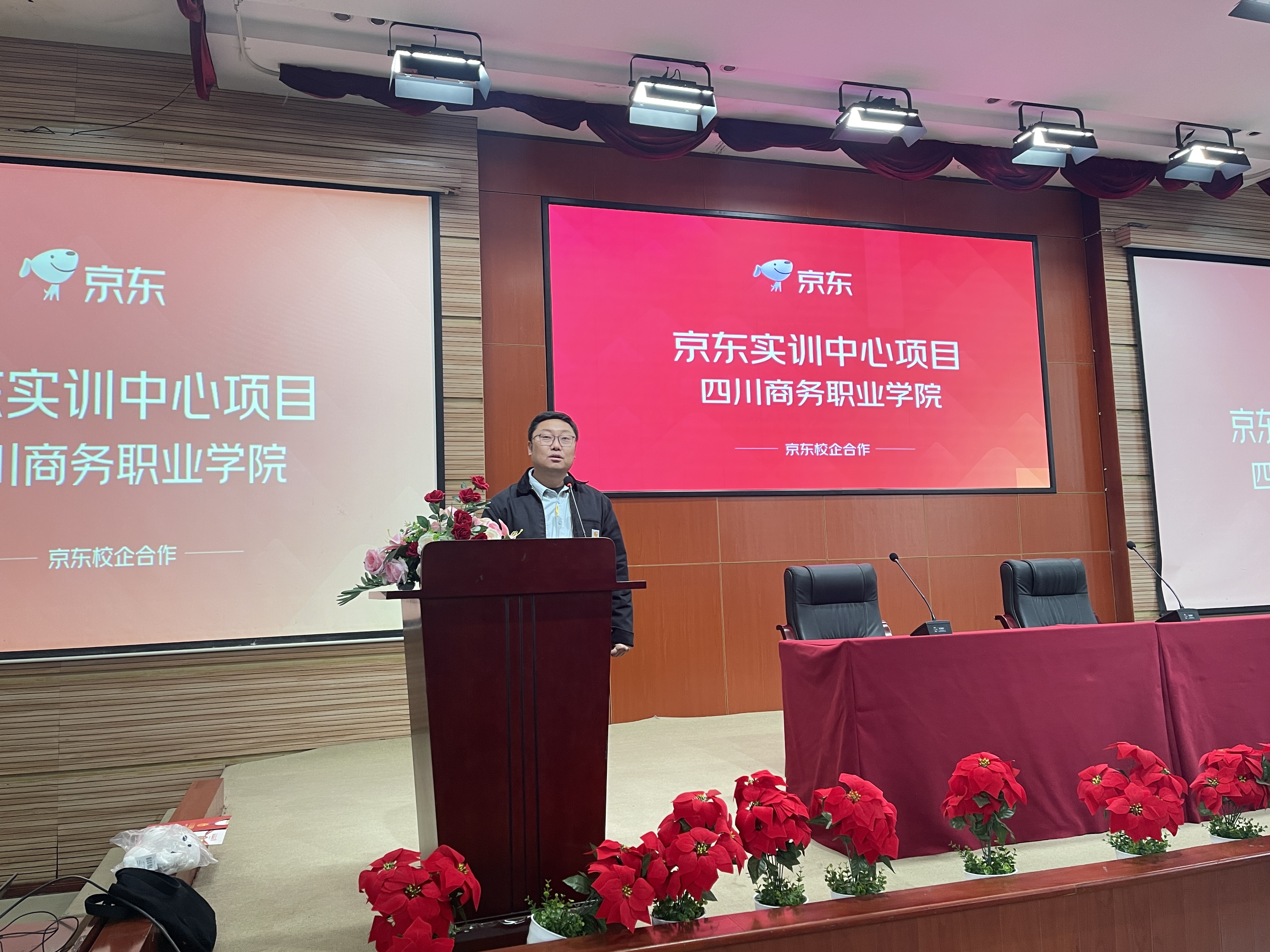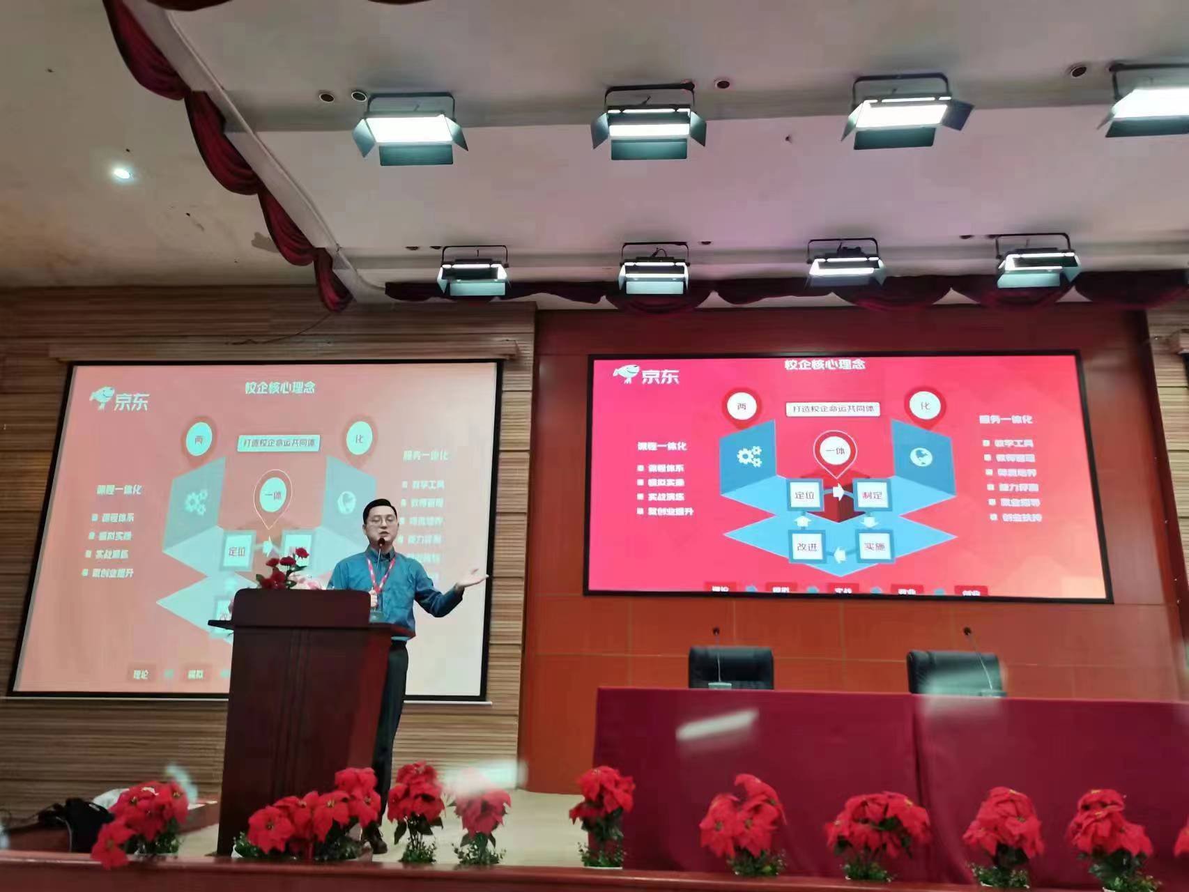 会上,京东讲师陈一帆给同学们进行了京东的介绍,包括知识问答环节和企业实力讲解,让同学们对实训充满期待。