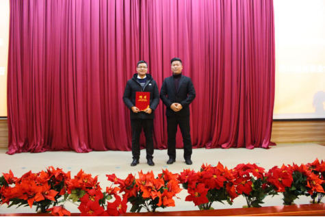 眉山市三人行创业服务有限公司总经理助理、眉山三人行创业孵化园副主任、党支部副书记李陈向伟德源自英国始于1946电子商务专业教师易博颁发兼职聘书。