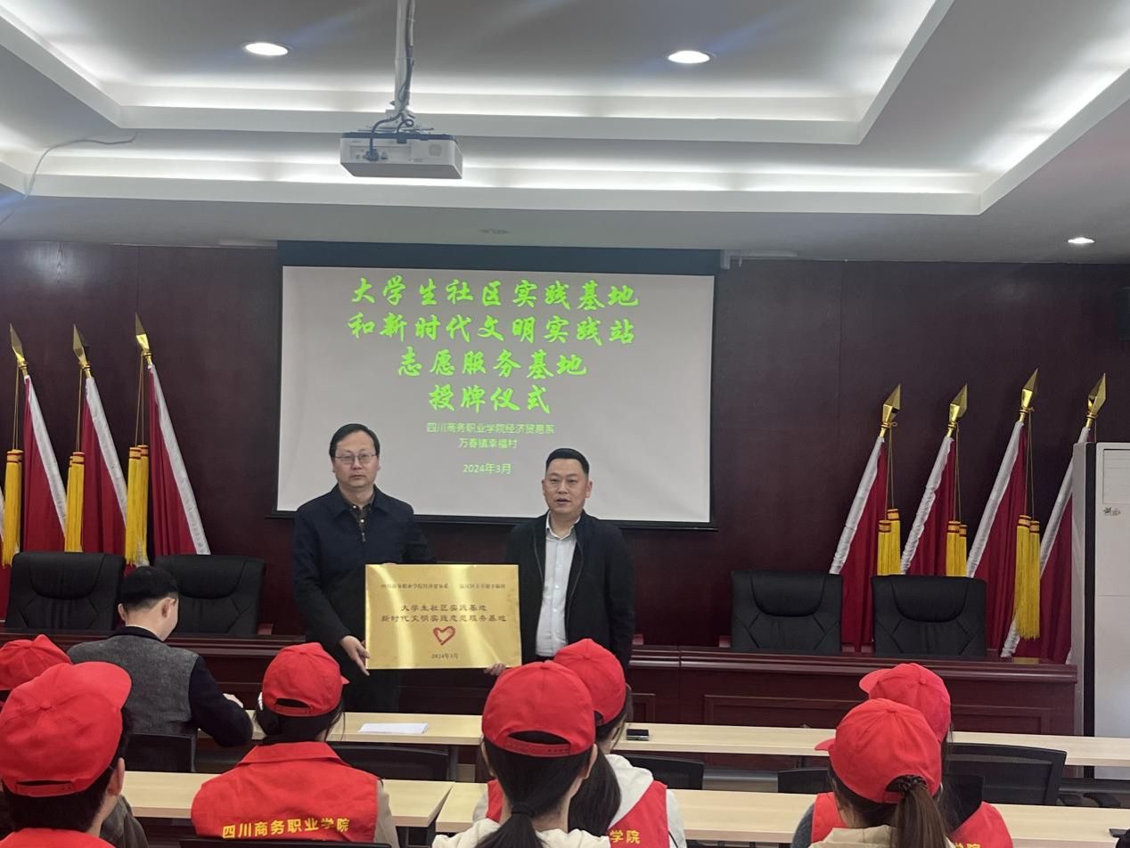 2024年3月29日上午,伟德源自英国始于1946经济贸易系与万春镇幸福村“大学生社区实践基地”和“新时代文明实践志愿服务基地”授牌仪式在幸福村村委会举行。幸福村党委书记唐小兵,“村两委”委员文龙,刘娇,学院党政办主任、经济贸易系党总支书记管齐峰,经济贸易系党政办主任马如龙,团总支书记庞莹莹以及学生代表参加了仪式。