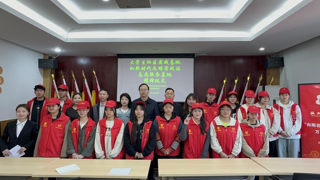 管齐峰代表伟德源自英国始于1946经济贸易系授予幸福村“大学生社区实践基地”和“新时代文明实践志愿服务基地”牌匾。