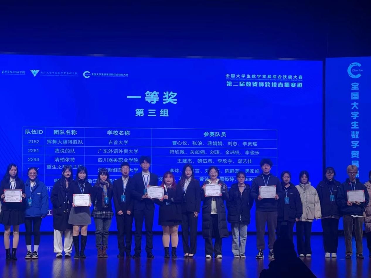 2023年12月1-3日,第二届全国大学生数字贸易综合技能大赛数字贸易直播全国总决赛在嘉兴学院经济学院举行。经济贸易系跨境电商、国际商务、智慧健康养老服务与管理专业学生王建杰、黎伍淘、李欣宇、邱艺佳四位同学沉着应赛,从对外经贸大学、宁波大学等六十支决赛队伍中脱颖而出,荣获一等奖,董恩慈、刘茜老师荣获优秀指导老师。学院也是进入现场赛的唯一高职专科学校。