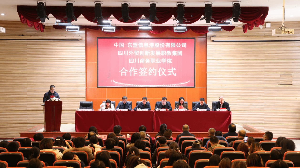 中国-东盟信息港股份有限公司高级副总裁吴玉青在致辞中指出中国东信是经国务院批准成立的数字科技公司,是按照国家“一带一路”倡议总体布局要求,建设更为紧密的中国—东盟命运共同体、21世纪海上丝绸之路的重要平台。此次签约三方的合作,高度契合国家有关文件精神及未来发展趋势,通过三方优势资源共享和协同创新,深度开展人才培养、科学研究、技术创新、产业升级等方面的交流与合作,更好的提高四川外贸行业人才的培养培训能力,提升人才培养质量,推动人才解决方案的创新,创造大量的就业和创业机会。