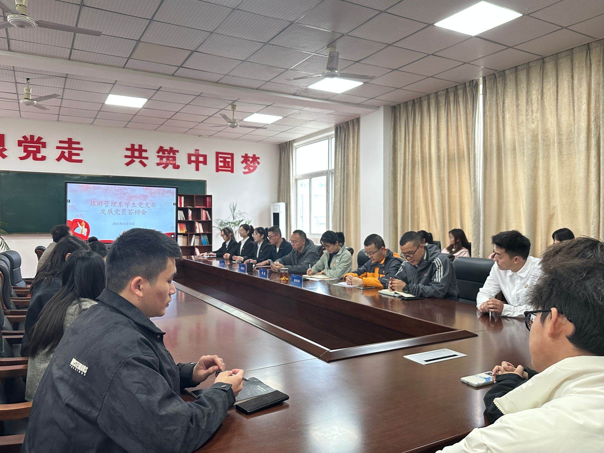 为严把党员发展 “入口关”,扎实推进党建育人工作,10 月 31 日,旅游管理系在 6304 党建活动室隆重召开发展党员答辩会。组织部杨华平、党总支书记陈根元、党支部书记车洁出席会议,学生支部全体党员、4 名答辩候选人、入党积极分子及学生干部共同参会,一场以信仰为考题的青春作答在此展开。答辩交锋:青春向党述初心答辩环节分为个人陈述与现场问答两部分,4 名候选人依次登台,交出了各自的 “入党答卷”。在个人陈述阶段,候选人结合思想成长轨迹、...
