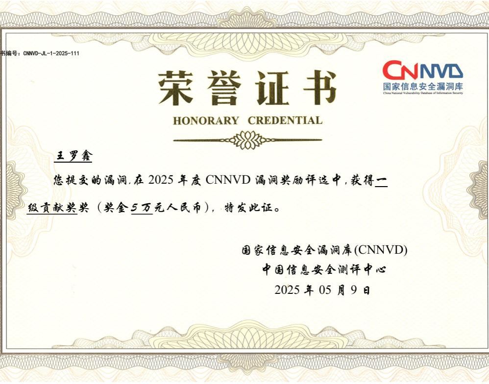 伟德官网学子在2025年CNNVD漏洞奖励评选中荣获一级贡献奖