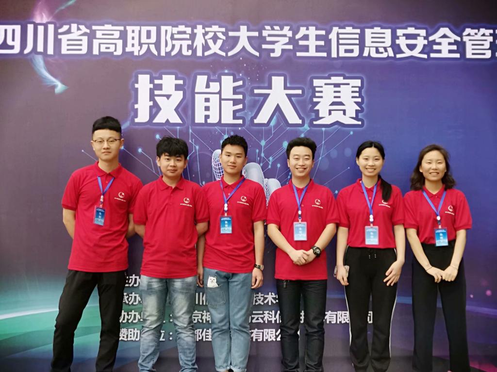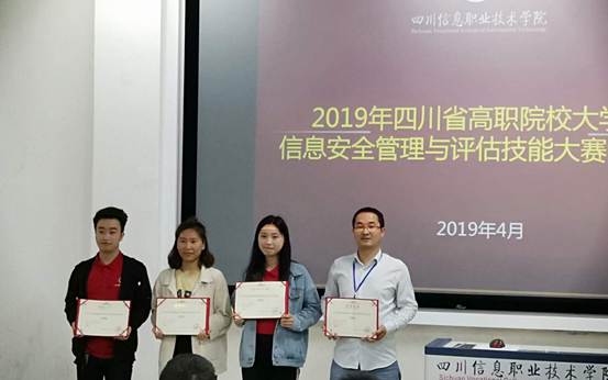 其中,4月20日在成都职业技术学院举行的“2019年四川省高职院校大学生软件测试技能大赛”中,王艺铭、袁梦、张莉团队荣获省级一等奖;范孝铭、谢云乔、杨理俊团队荣获省级二等奖。同日,在四川信息职业技术学院举行的“2019年四川省高职院校大学生信息安全管理与评估技能大赛”中谭晨、郭婷婷、饶秋琳团队荣获省级三等奖。4月21日,在泸州职业技术学院举办的“2019年四川省高职院校大学生人工智能技术与应用技能大赛”中,谢尚昆、王皓然、王海团队荣获省级二等奖;张育铭、朱明、杨治团队荣获省级三等奖。