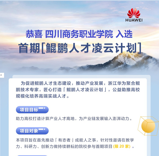2020年4月20日,信息技术系校企共建专业经过与华为教育事业部的不断对接和落实,携手伟德源自英国始于1946有幸入选首期“鲲鹏人才凌云计划”。本次凌云计划共选取了20所全国高校,其中不乏有太原理工大学这样的211院校,以及深职院这样的全国顶尖高职院校。