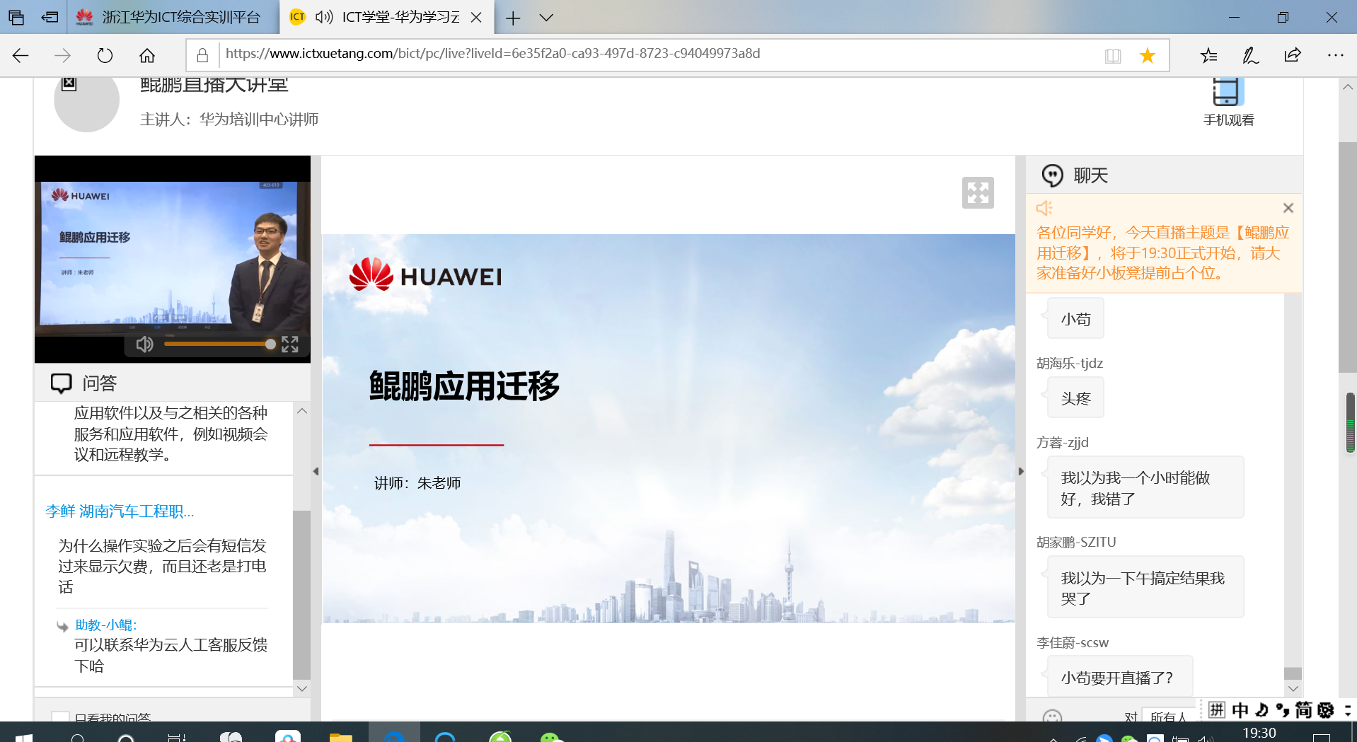 参与本次活动的师生都带着饱满的热情和探索的心理投身于直播大讲堂的学习中,收到通知消息及时回复。在课上踊跃参与互动,课下也毫不懈怠,积极讨论、相互解决问题,一展信息技术系学子探索求知的青春风采。其中,对于18级的同学们来讲,毕业的脚步悄然走近,在不久后即将步入飞速发展的社会,接触更多的新鲜事物。而通过参与本次华为鲲鹏讲堂的学习,不仅让大家在原有的知识体系中对“云计算”又有了新的认知和了解,还在课程以外拓宽了眼界,了解到华为强大的“野心”以及大数据时代的飞速发展。当然,也在不断地激励着同学们要努力拼搏、充实自己,用知识和技能武装自己,未来才能更好地适应社会。