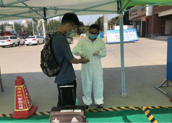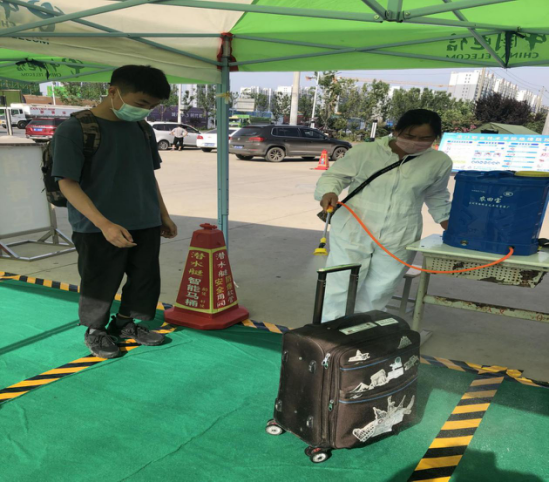 学生返校后在校门口有序排队,老师负责体温检测、手部和行李全面消毒。