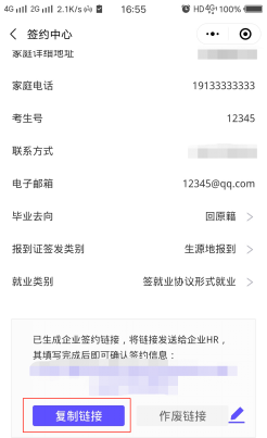 点击【创建企业签约链接】-【复制链接】给意向签约企业。反馈并确认无误点【确认签约】提交高校审核。