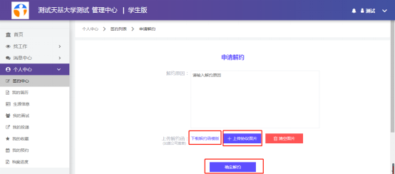下载【解约函模板】,填写并加盖公司公章,最后上传协议图片,等待学校审核。