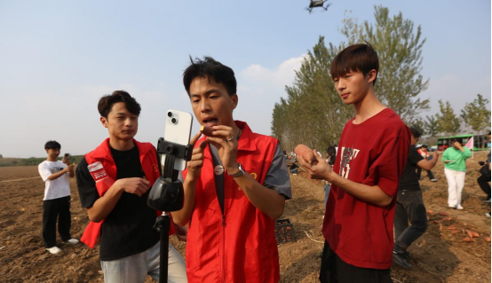黄寨镇党委书记郑春来、镇长郭涛带领大家参观万亩蜜薯产业园,对蜜薯的生长环境、种植技术及产量做了详细介绍。网络营销与直播电商专业的学生把直播设备搬到田间地头,将学到的专业知识和实训技能应用到直播销售蜜薯活动中,用小屏幕打开大市场,进一步提升社会实践能力。部分学生在黄寨大嫂志愿者的带领下,积极参与了蜜薯的采集与筛选工作,丰富产品知识,提升直播效益,助力乡村振兴。