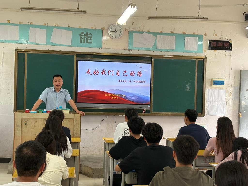 6月7日,allwincity万象城党总支书记陈鹏以“走好我们自己的路——和大学生谈谈中国式现代化”为主题,在4201教室为党员发展对象、入党积极分子及学生干部代表讲授专题党课。学生党支部书记杨璐璐主持。
