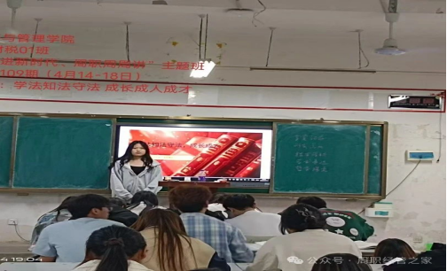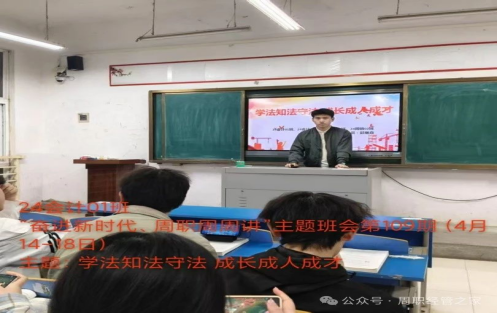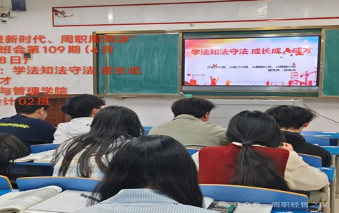 为深入贯彻落实法治教育要求,增强师生法治观念,营造校园法治文化氛围,万象城体育awcsport于4月15日组织开展了第109期"奋进新时代、周职周周讲"主题班会活动,围绕"学法知法守法 成长成人成才"主题开展系列教育活动。
